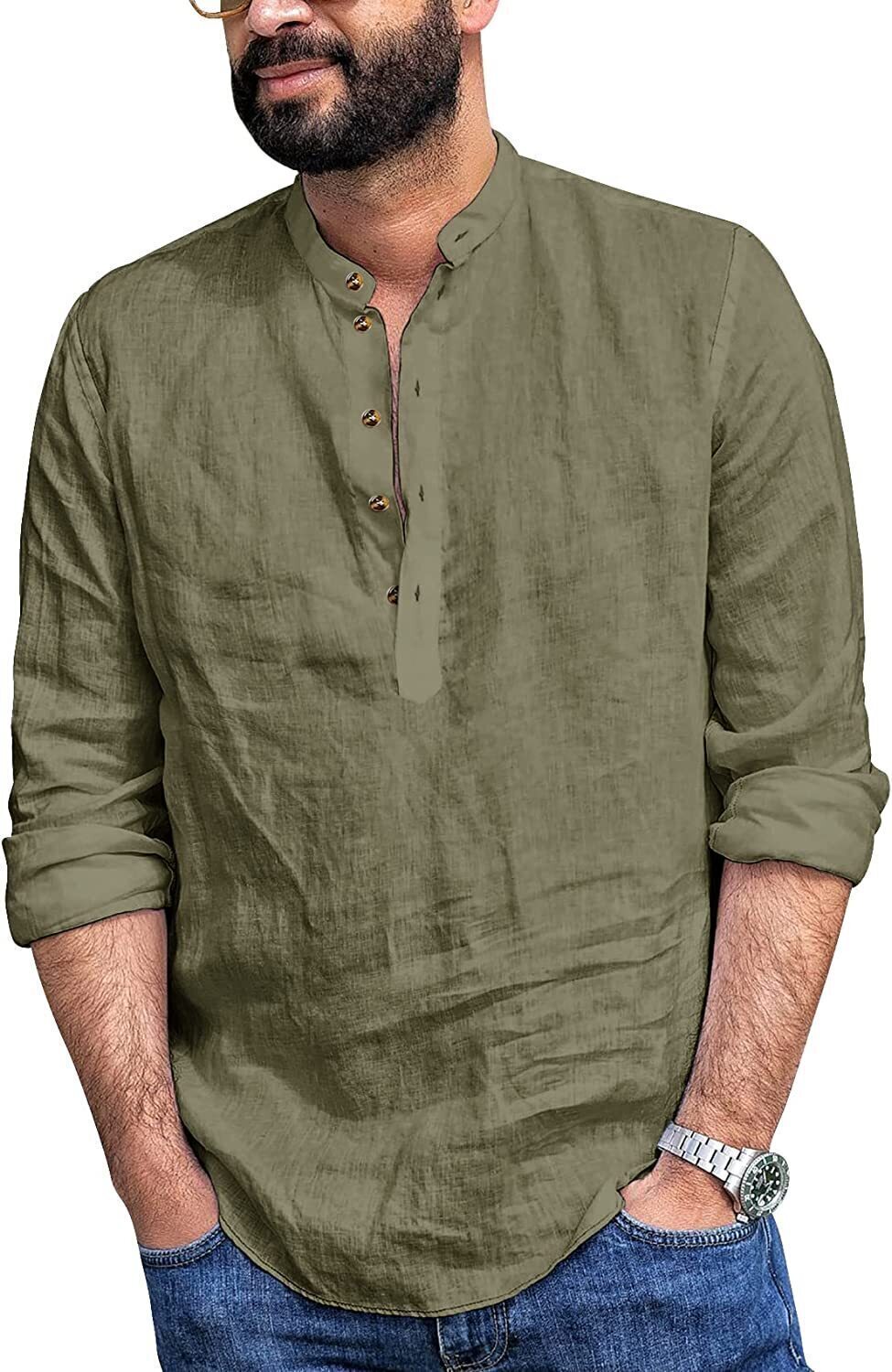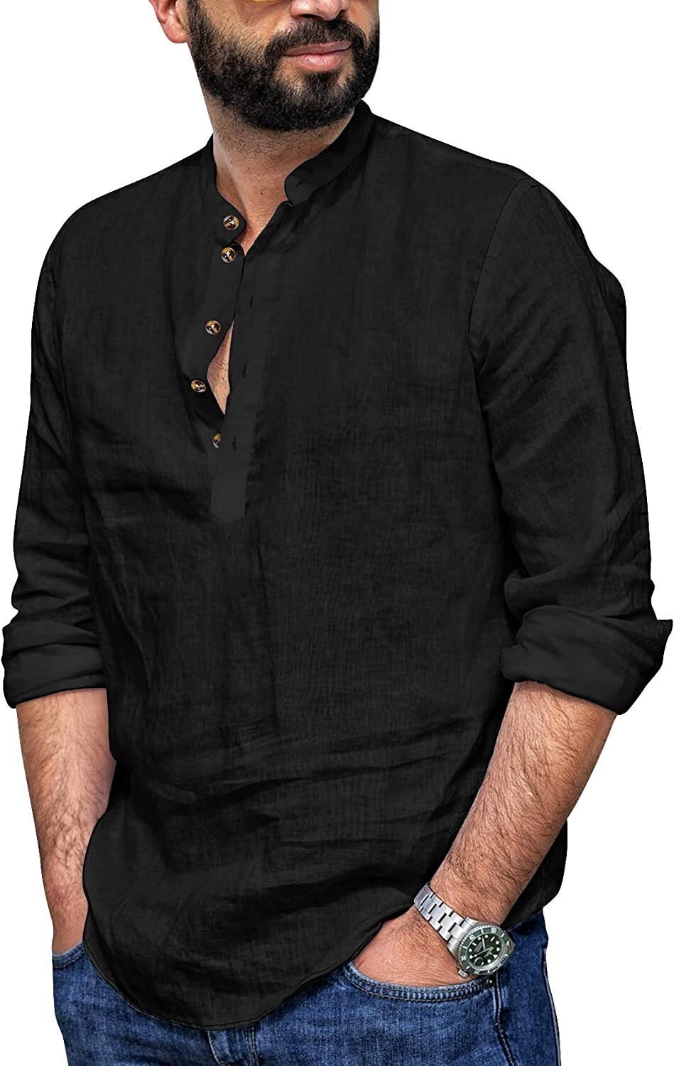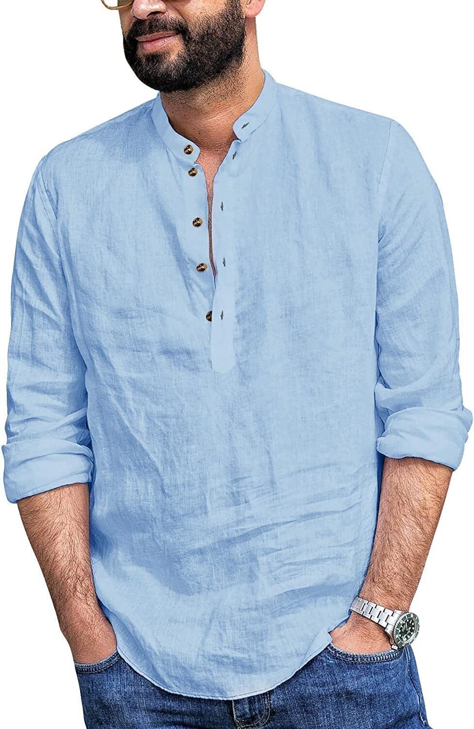 • Feature: Cotton linen summer shirts for men, classic henley neck, stand collar, 4 button plackets, long sleeve, solid color, regular fit. It's a good pullover basic t-shirt.