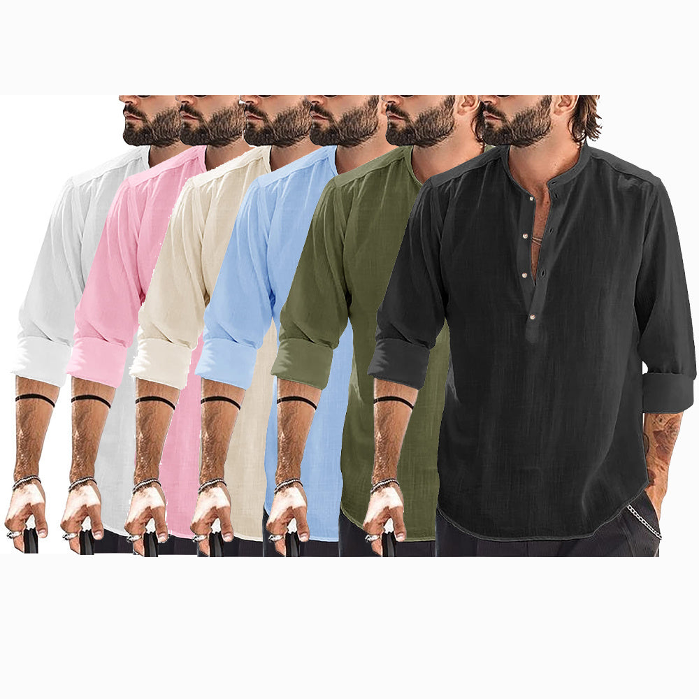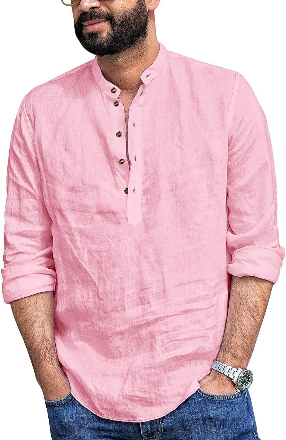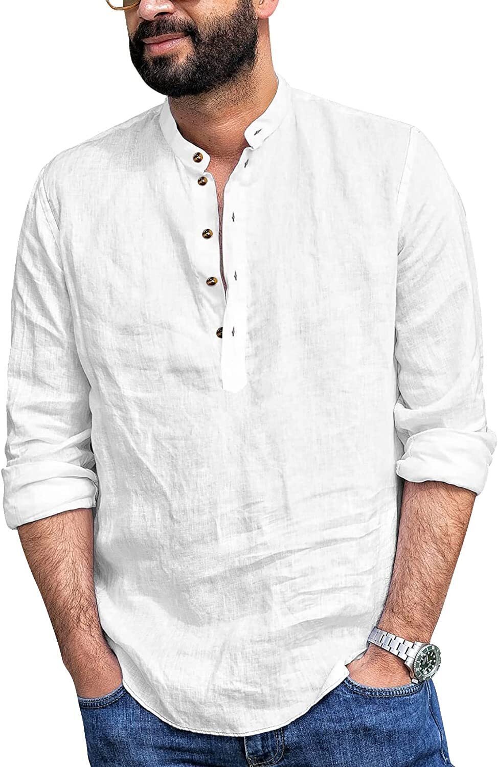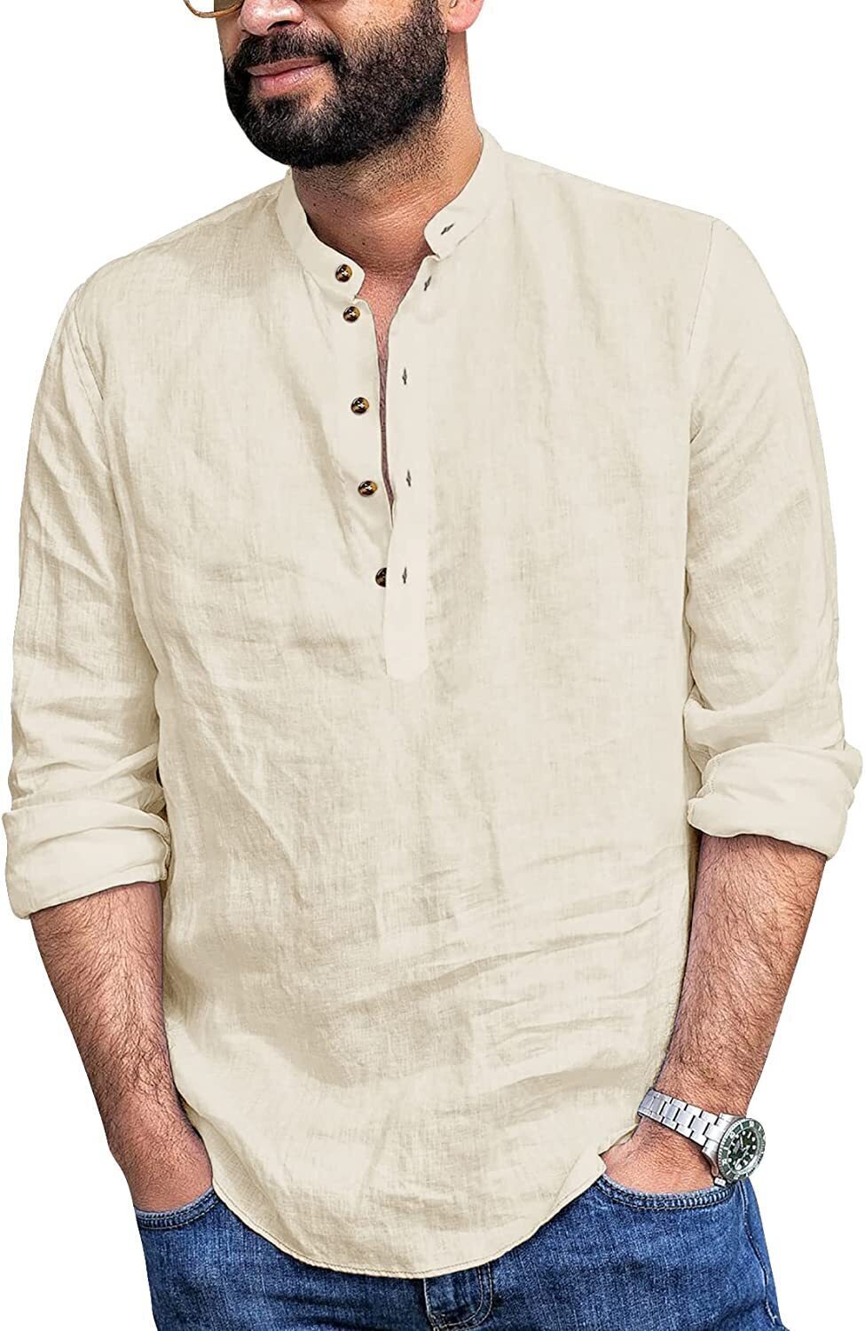 • Feature: Cotton linen summer shirts for men, classic henley neck, stand collar, 4 button plackets, long sleeve, solid color, regular fit. It's a good pullover basic t-shirt.