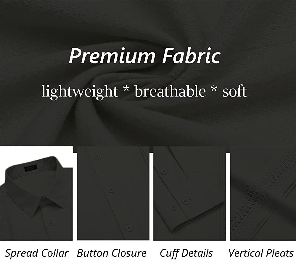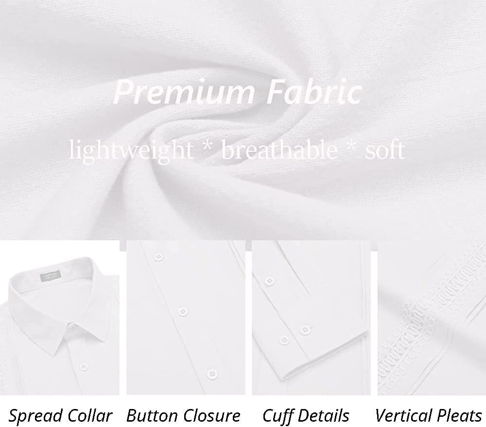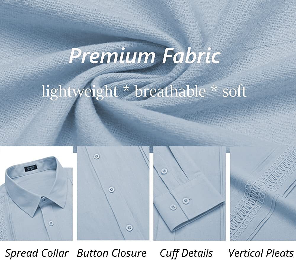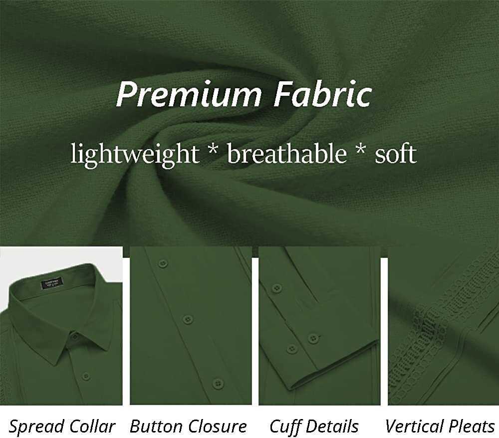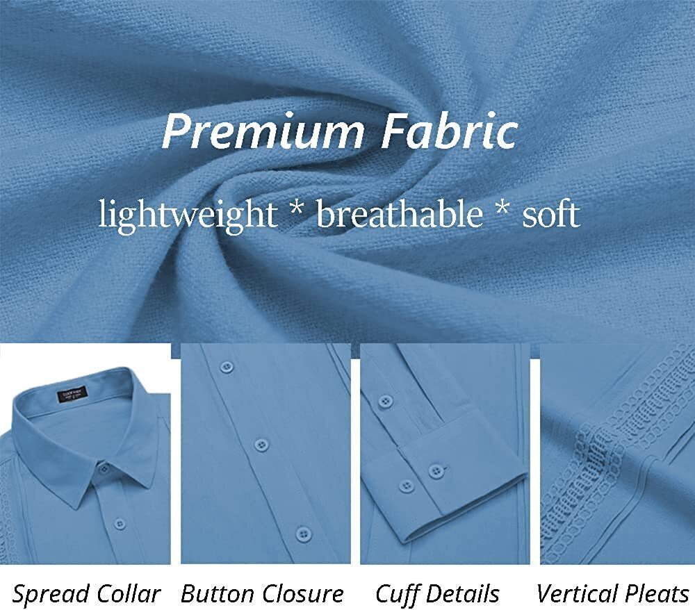 • Stylish Design: The mens cuban shirts featuring vertical pleats, decorative buttons, long sleeves, spread collar and adjustable cuffs. Classic Cuban style and excellent tailoring are the distinguishing features of this men's shirt.
