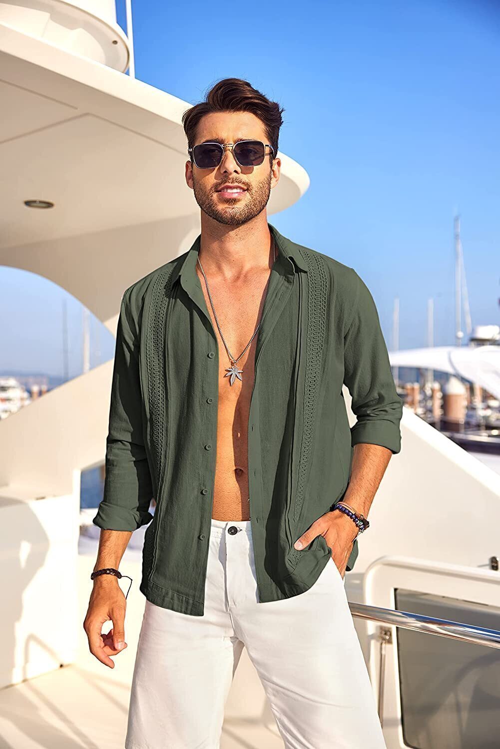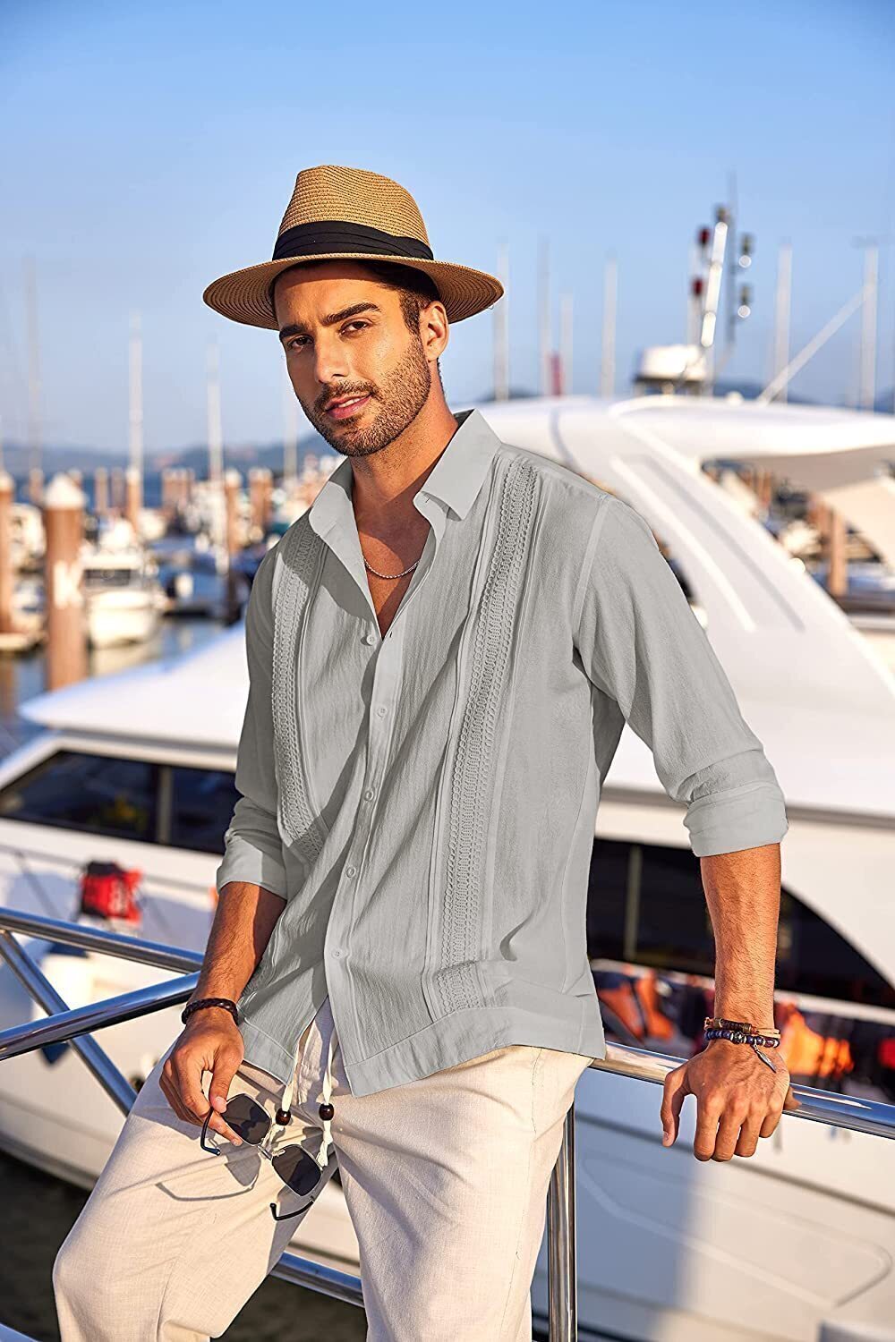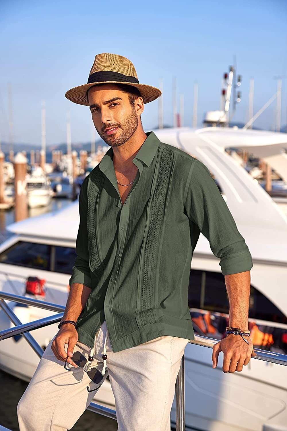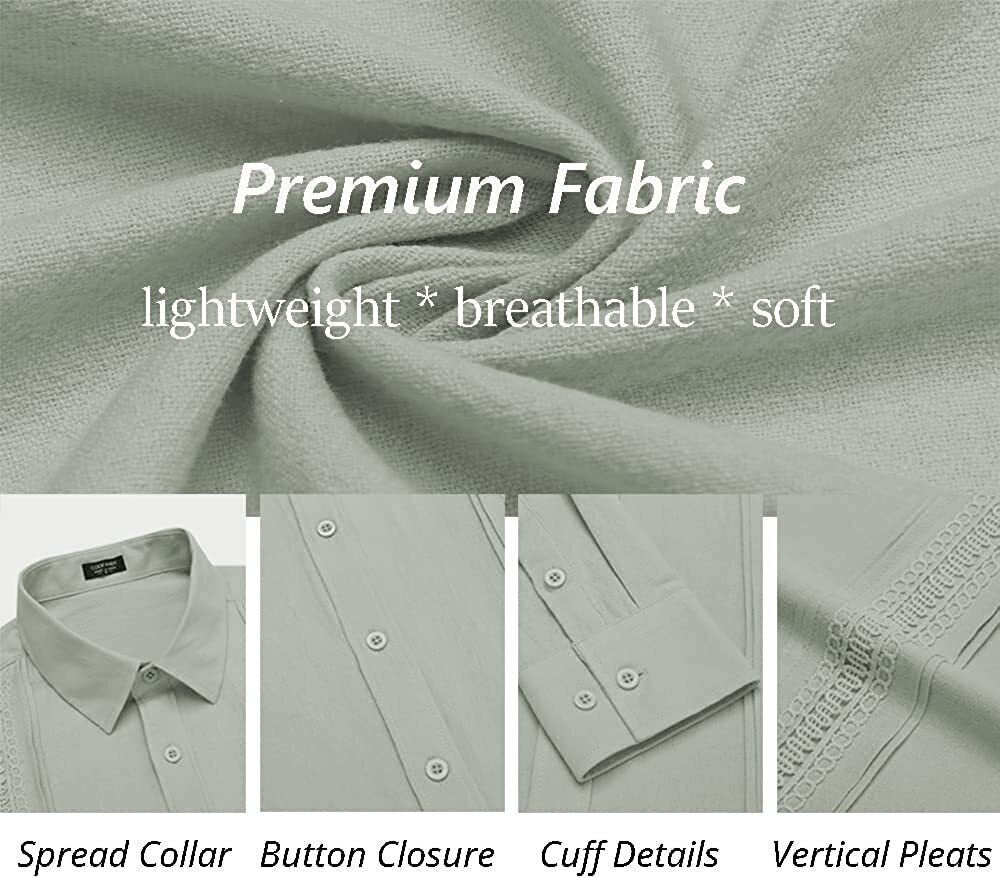 • Stylish Design: The mens cuban shirts featuring vertical pleats, decorative buttons, long sleeves, spread collar and adjustable cuffs. Classic Cuban style and excellent tailoring are the distinguishing features of this men's shirt.