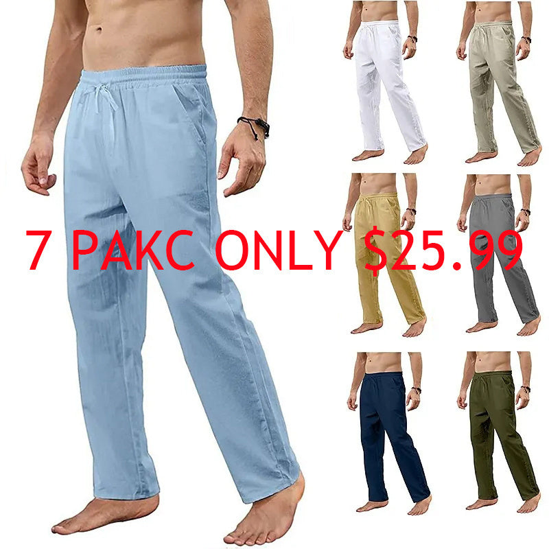 7 PACK Men's Linen Pants Trousers Beach Pants Straight Pants Pocket Drawstring Solid Color Plain Breathable Soft Full Length Home Casual Linen Fashion Classic Loose Fit White Black Micro-elastic