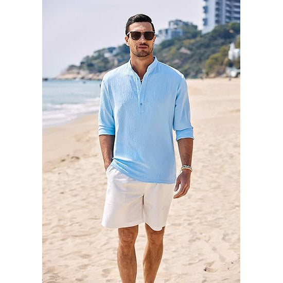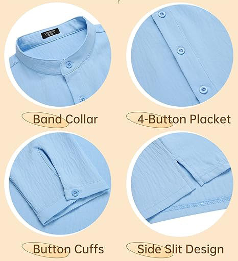 - 【BEACH ESSENTIAL】-- This men's long sleeve collarless shirt featuring with stand collar, button closure, long sleeve, slight crinkle design, side slits, pendulum and loose fit style, which can make you look casual and handsome. The simple and classic design makes it never be out of fashion.