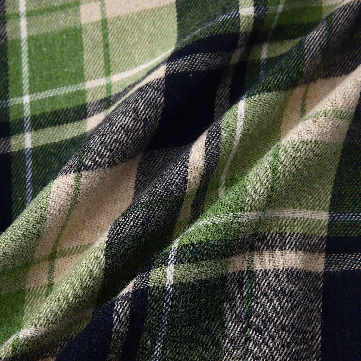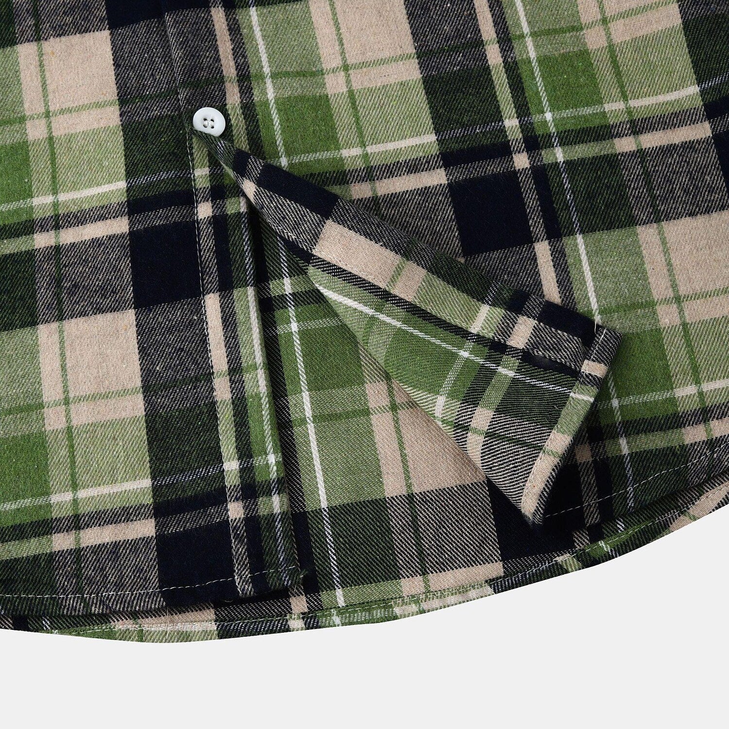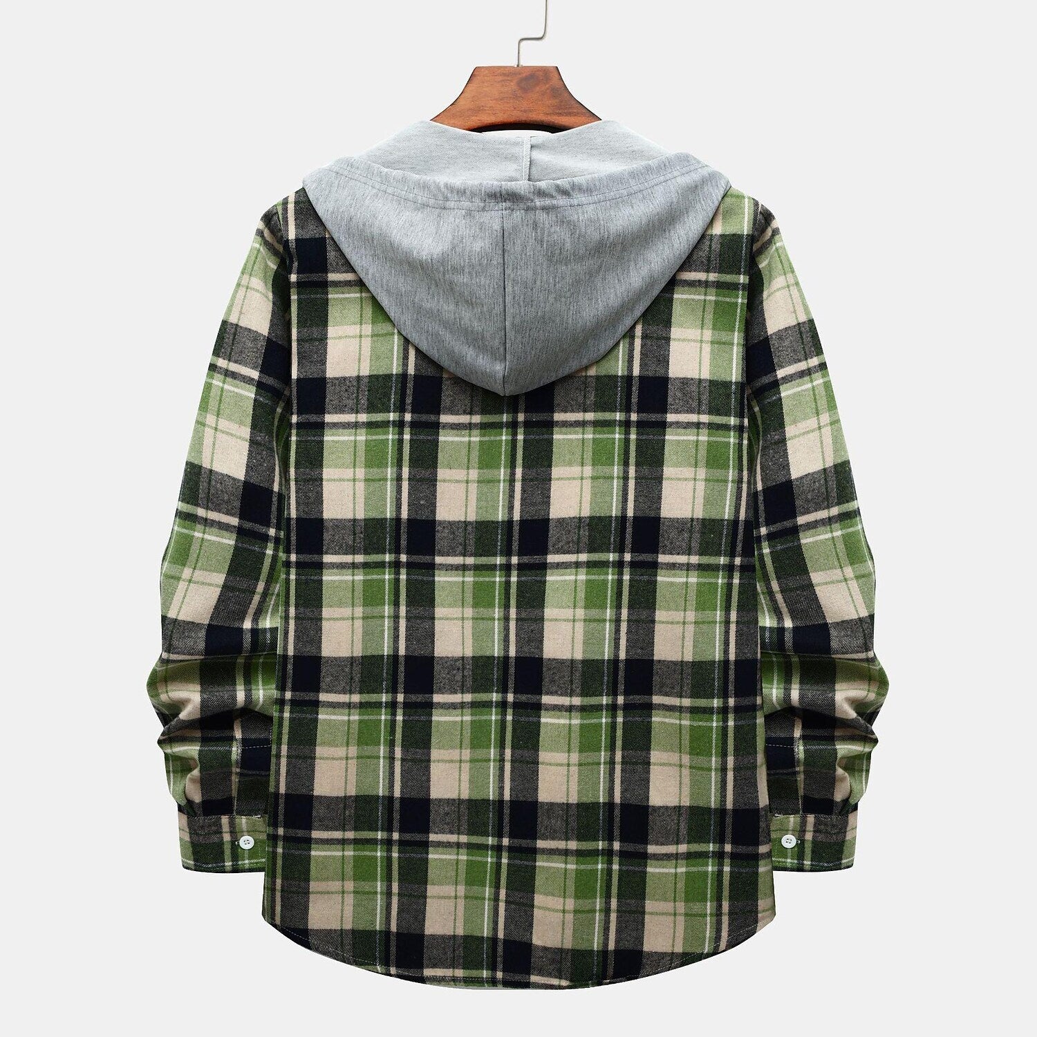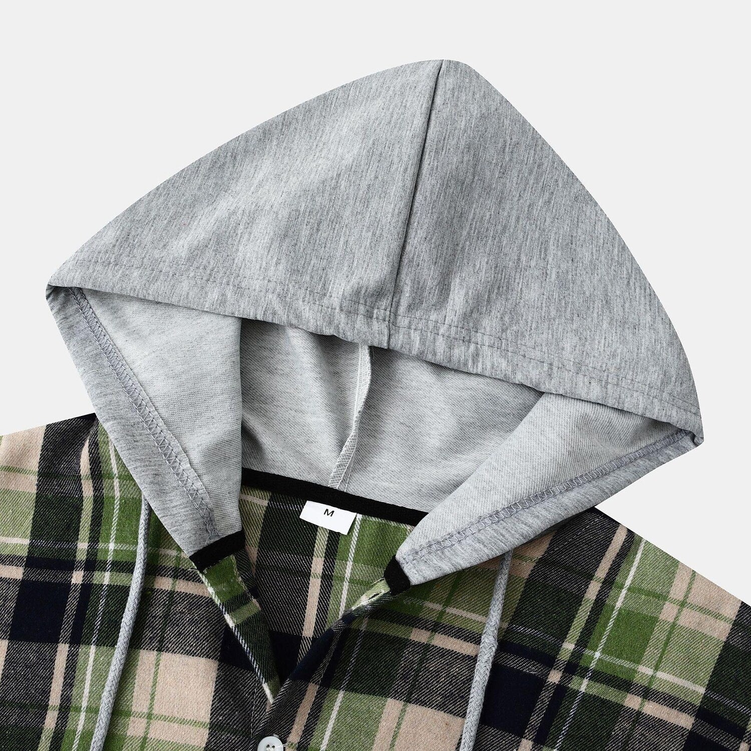 Men's Long Sleeve Flannel Brushed Check Hooded Casual Shirt Green Khaki